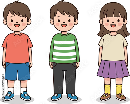 © MstMuktarinaAkter, Fototapeta premium Cute cartoon kids standing, happy children illustration, boy and girl characters, casual clothes, smiling faces, isolated white background, vector drawing