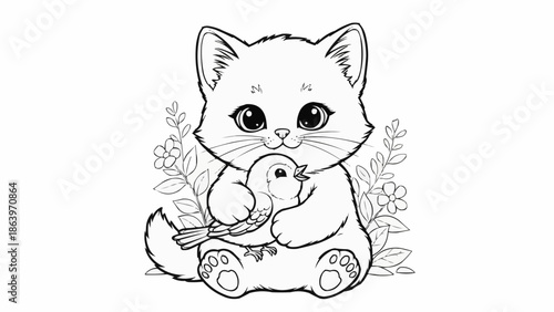 © bagong, Obraz premium Cute cartoon kitten holding a small bird illustration for coloring.