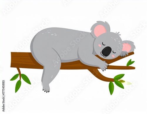 © sala, Fototapeta premium Cute cartoon koala sleeping on a tree branch isolated on white background. Koala