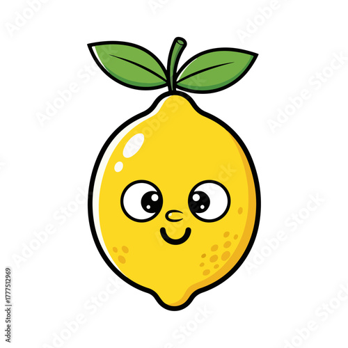 Obraz premium Cute cartoon lemon character illustration, happy smiling citrus fruit with green leaves, fresh and sweet.
