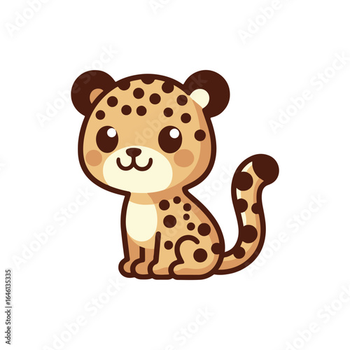 Obraz premium Cute cartoon leopard sitting playfully with a smiling expression against a white background