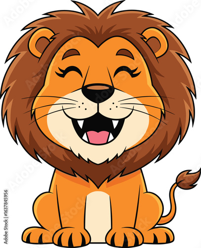 Obraz premium Cute cartoon lion sitting with brown mane, happy expression, tan face, friendly animal character, flat vector illustration for kids
