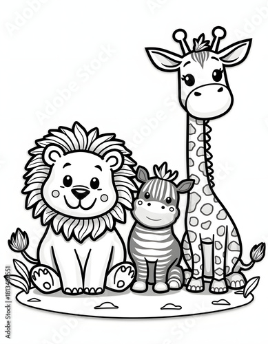 © Yasin, Obraz premium Cute cartoon lion, zebra, and giraffe friends in black and white