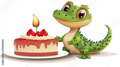 Obraz premium Cute Cartoon Lizard with Strawberry Birthday Cake