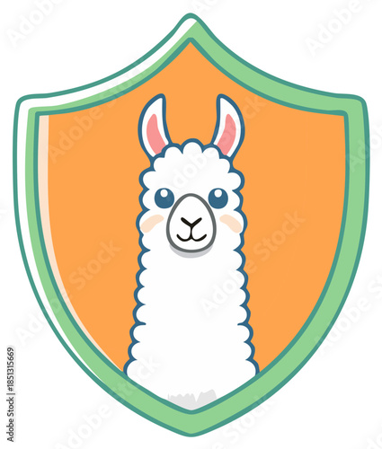 Fototapeta premium Cute cartoon llama mascot inside a green and orange shield emblem for a team or gaming logo