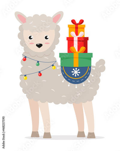 Fototapeta premium Cute, cartoon llama or alpaca with gift boxes and garlands. Design element for greeting cards. Birthday, Christmas. Vector illustration in flat style