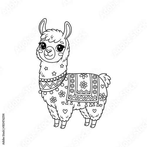 Fototapeta premium Cute cartoon llama with decorative blanket and floral patterns for coloring