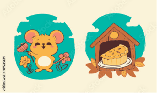 © Lifia, Naklejka premium Cute Cartoon Mouse with Flowers and Pie in Rustic Setting Design