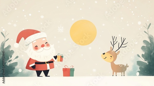 © QuietWord, Naklejka premium cute cartoon nursery illustration, tiny Santa Claus give a gift to a reindeer in Christmas night