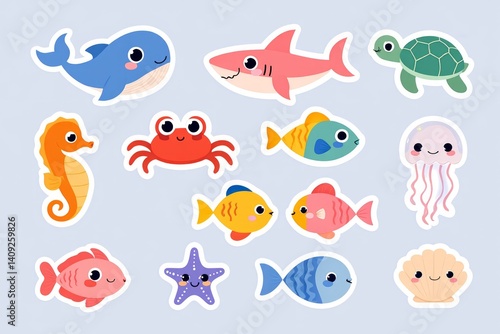 Fototapeta premium Cute cartoon ocean creatures on a light gray background.