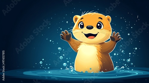Fototapeta premium Cute cartoon otter waving in water splashing