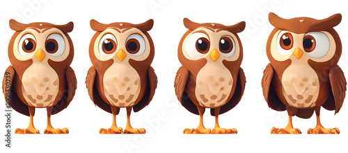 Fototapeta premium Cute cartoon owl character in multiple angles for kids' illustration and...