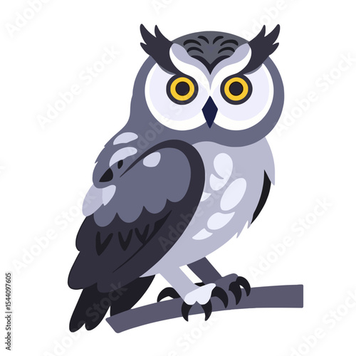 Fototapeta premium Cute Cartoon Owl Illustration-Gray Owl with Yellow Eyes-Wise Bird Sitting on...