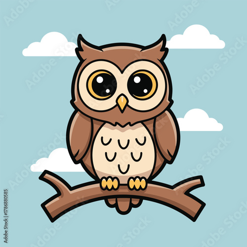 Fototapeta premium Cute cartoon owl perched on a tree branch against a blue sky background.