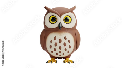 © hana, Fototapeta premium Cute cartoon owl with big eyes and brown feathers on transparent background