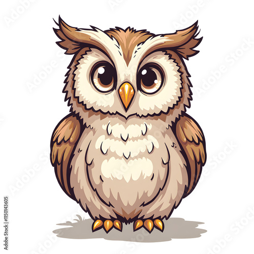 © Nadiya, Fototapeta premium Cute cartoon owl with big eyes and fluffy feathers on white background