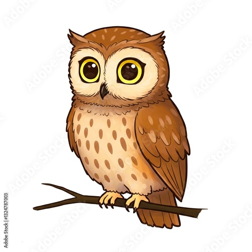 Naklejka premium Cute cartoon owl with big yellow eyes perched on a branch, illustrated in a...