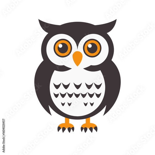 © Muhtarom, Naklejka premium Cute Cartoon Owl With Black And White Feathers With Orange Eyes And Feet On White Background
