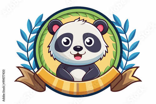 Fototapeta premium Cute Cartoon Panda Bear with Green Bamboo Leaves and Ribbon