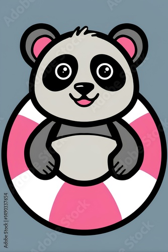 Naklejka premium Cute cartoon panda character floating in a pink and white lifebuoy, smiling...
