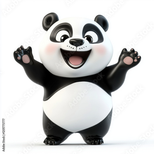 Naklejka premium Cute cartoon panda character with joyful expression, arms raised in...