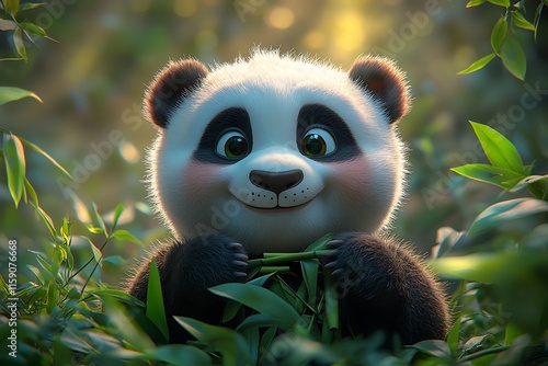 Fototapeta premium Cute Cartoon Panda Cub Enjoying Bamboo in Lush Forest