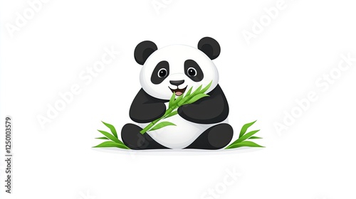 Fototapeta premium Cute cartoon panda happily eating bamboo in a minimalist white background setting