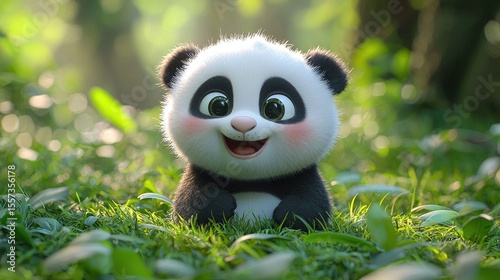 © rohmat, Fototapeta premium Cute cartoon panda sits in grass.