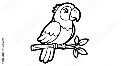 Obraz premium Cute Cartoon Parrot Perched on a Branch, Ready for Coloring Book, Isolated White Background