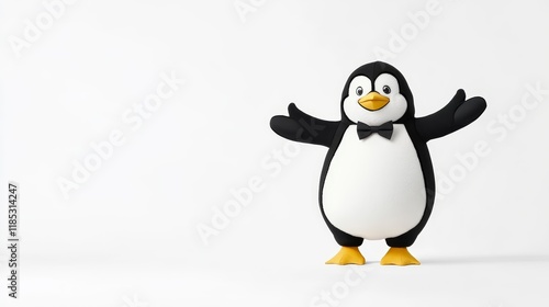 © อาริษา วันดี, Obraz premium Cute cartoon penguin character in tuxedo with outstretched arms against a plain white background, ideal for children's themes, celebrations, or winter activities promotional materials