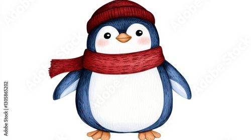 © aun, Naklejka premium Cute Cartoon Penguin in Winter Hat and Red Scarf on White Background