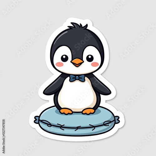 © cookiecutter, Naklejka premium Cute Cartoon Penguin Sitting on a Round Blue Base for Kids' Designs