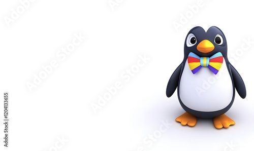 Fototapeta premium Cute cartoon penguin wearing a colorful bow tie on white background.