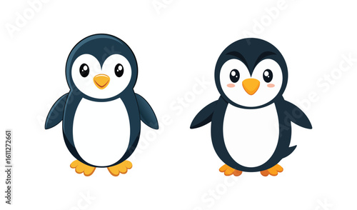 Fototapeta premium Cute cartoon penguins standing side by side with white background