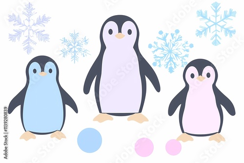 © possawat, Naklejka premium Cute Cartoon Penguins with Snowflakes and Colorful Circles