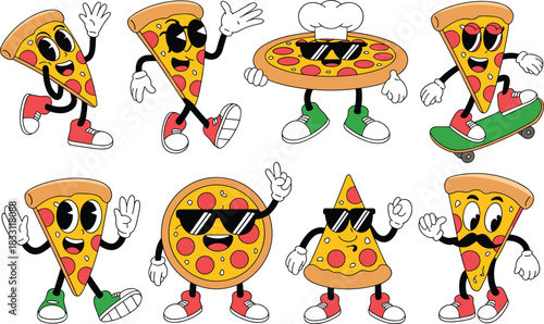 Fototapeta premium Cute cartoon pizza mascot characters set with funny expressions, sunglasses, chef hat, skateboard, playful poses, colorful food illustration collection.