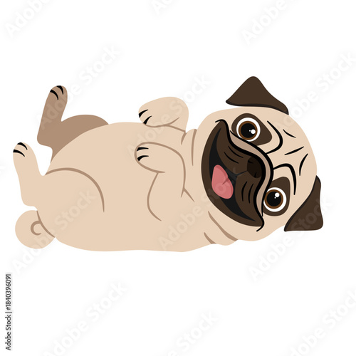 © Tais, Fototapeta premium Cute cartoon pug dog lying on its back and laughing. Funny vector illustration isolated on white background.
