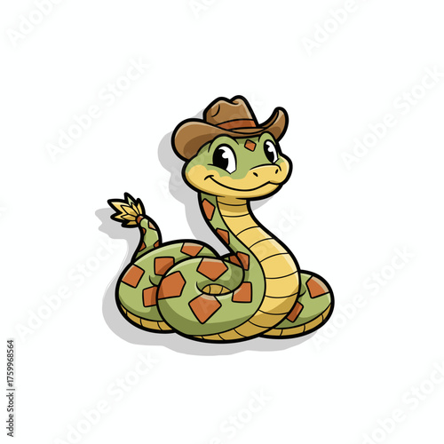 Fototapeta premium Cute cartoon rattlesnake wearing a cowboy hat with a cheerful expression, on...