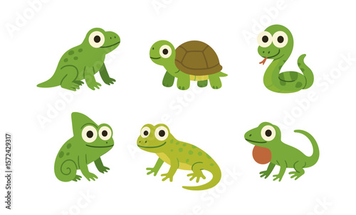 Fototapeta premium Cute cartoon reptiles: alligator, frog, turtle, snake, chameleon, lizard...