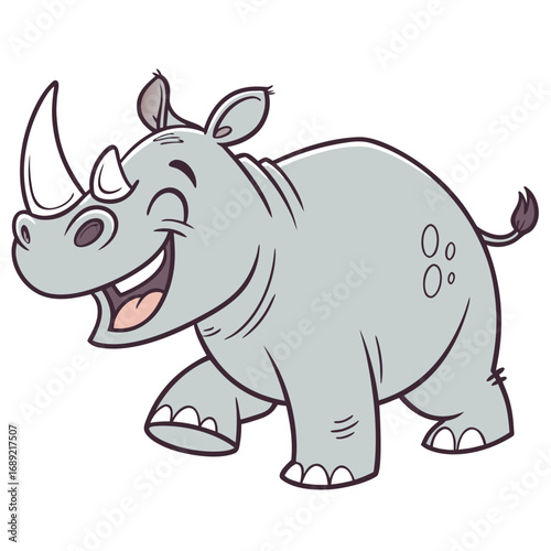 Fototapeta premium Cute cartoon rhinoceros with a big happy smile walking and looking joyful
