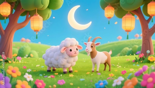 Naklejka premium Cute Cartoon Sheep and Eid Lanterns in Green Meadow