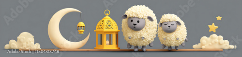 Obraz premium Cute cartoon sheep jumping beside Eid lantern with crescent moon isolated on...