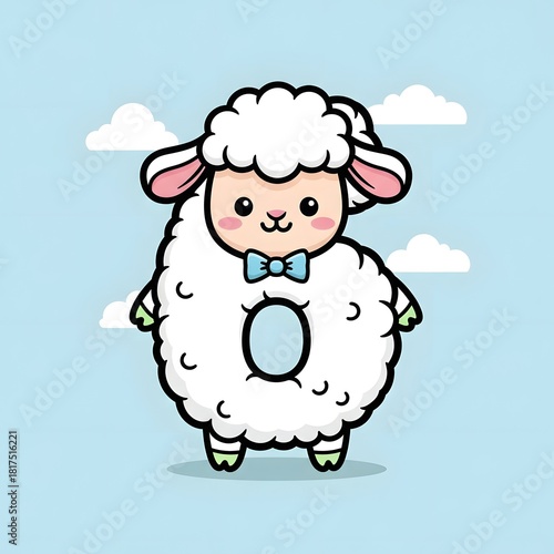 © menang, Fototapeta premium Cute cartoon sheep with a bow tie, fluffy white wool, and a friendly expression, standing in front of a blue sky.