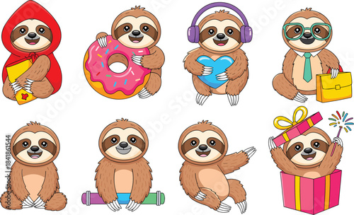 © Kharshad Creative, Fototapeta premium Cute Cartoon Sloth Character Collection Vector Illustration Featuring Sloths with Donut, Headphones, Glasses, and Holding Gifts for Holiday and Party Themes.