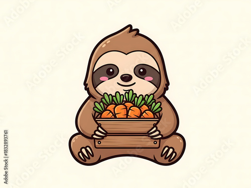 Fototapeta premium Cute cartoon sloth character holding a wooden crate of carrots