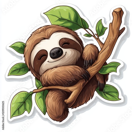 © Koborixgen, Naklejka premium Cute cartoon sloth hanging on a branch, with a happy expression.