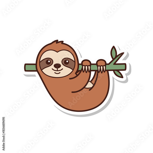 © kasum, Naklejka premium Cute Cartoon Sloth Hanging on a Branch with Green Leaves Vector Illustration