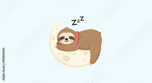 Obraz premium Cute cartoon sloth peacefully sleeping on a crescent moon