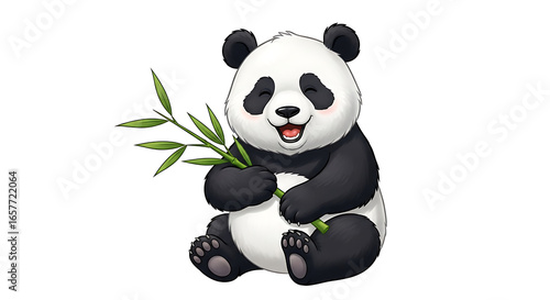 Obraz premium Cute Cartoon Smiling Panda Character Holding Bamboo Stalk Illustration