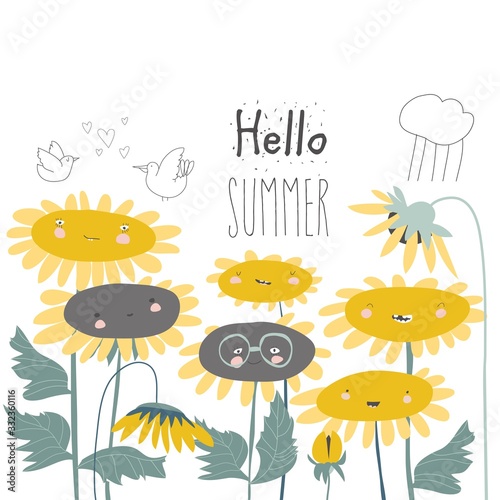 © Maria Starus, Naklejka premium Cute cartoon smiling sunflowers. Flowers with smiley faces.
